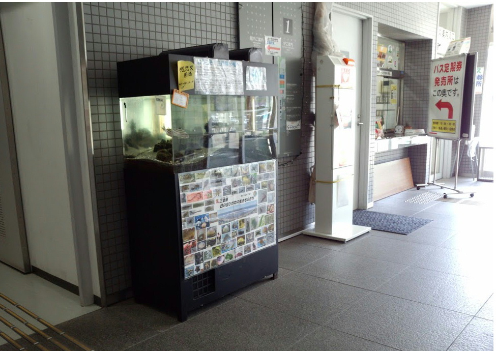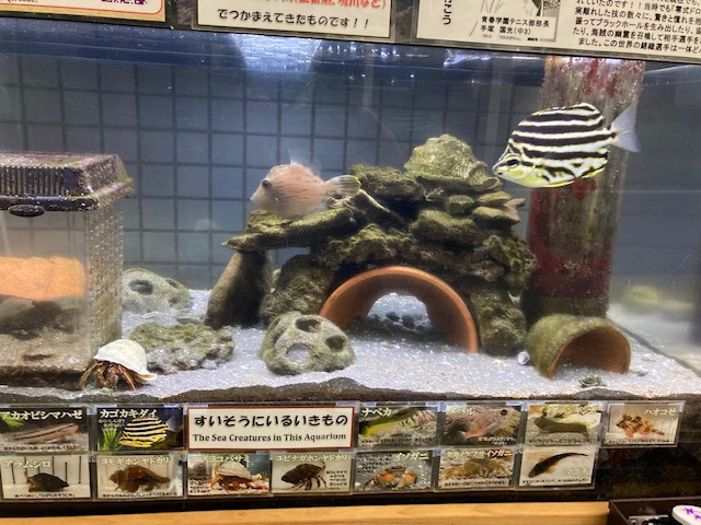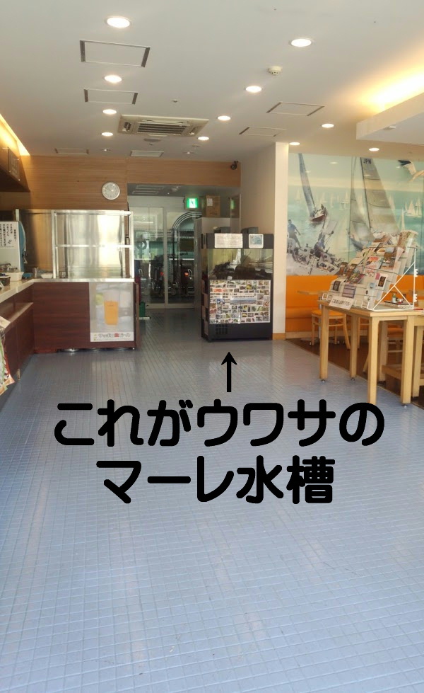 一方、マーレ水槽は昨年11月23日、 これまでの観光インフォメーションセンターから 隣りのS-フロントさんへ移りました。 喫茶、お食事所ですが、ミニコンビニもあります。
