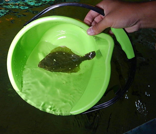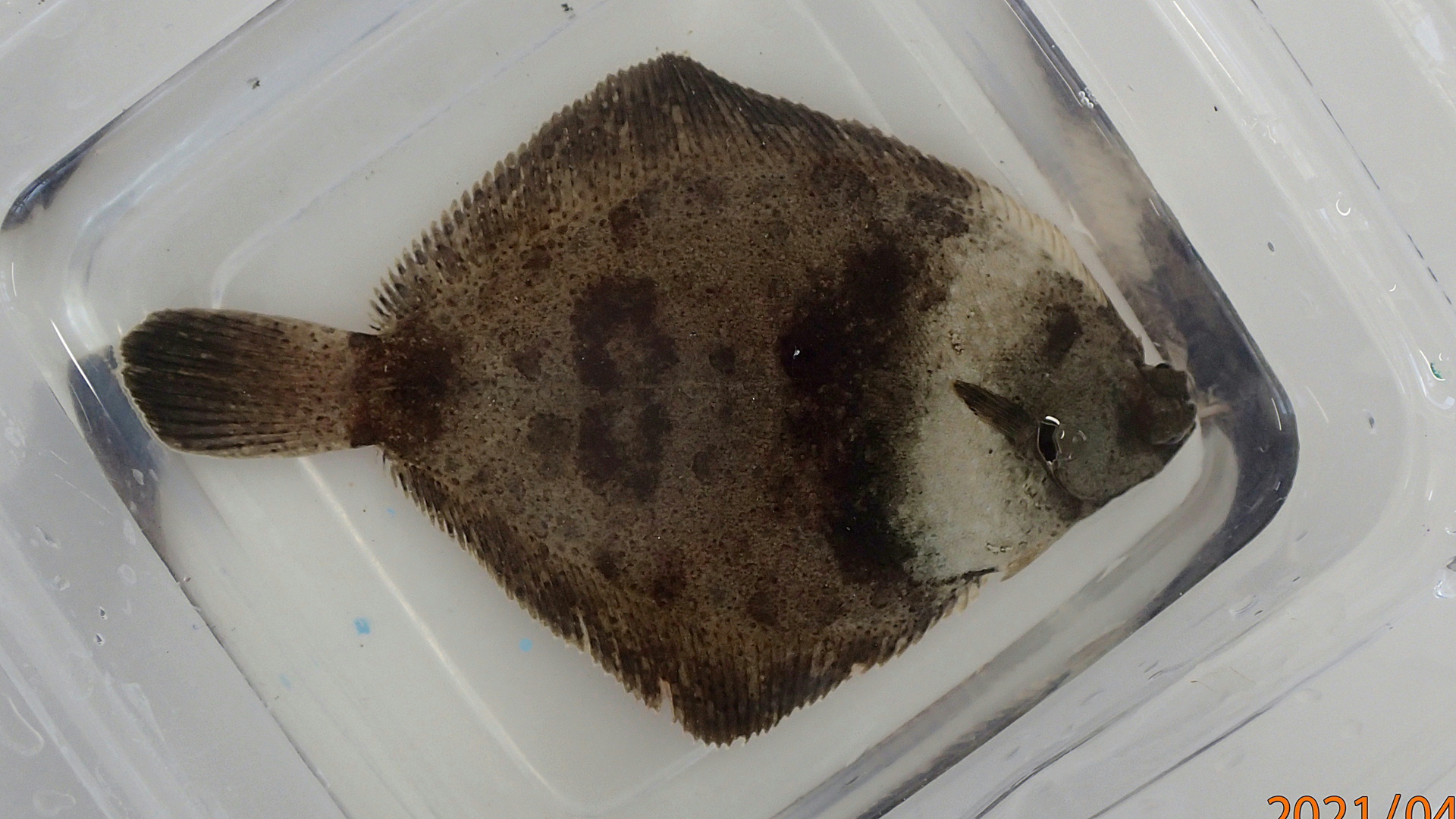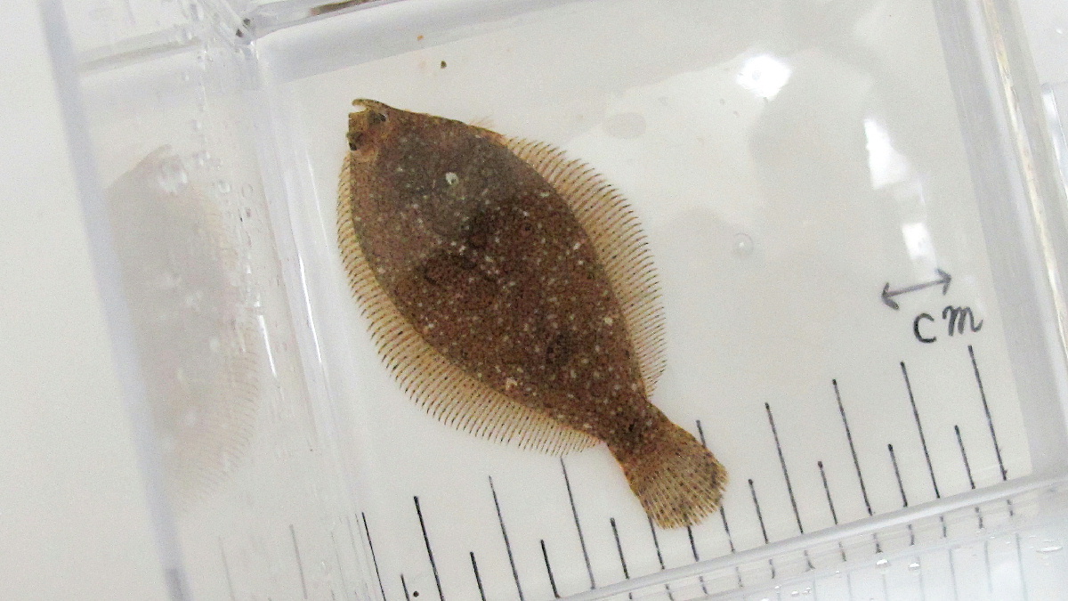 「メイタガレイ」の子供(7pぐらい)です。最大でも30pぐらいにしかならない小型のカレイですが、その味の良さから水産物として需要の高いカレイです。