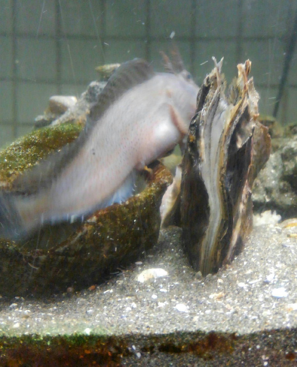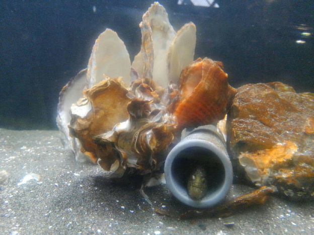 さて、年が明け世間も慌ただしくなってきましたが、水槽内は平常運転… ということでレイアウトを変更してみました。昨年の望年会BBQで手に入れた(笑)立派なカキ殻を入れてやると、すぐにトサカギンポがヒョロロロ〜と近づいてきました。やっぱりカキ殻が好きなんですね〜。