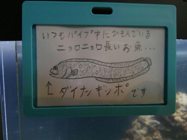作業をしていると親子連れが3組ほど水槽を見にきてくれました。 だだ、第一声が「魚いないね〜」。…。 私が「ここにいるよ」とダイナンギンポをパイプから出してやると、「すごーい」と喜んでくれて、一安心。