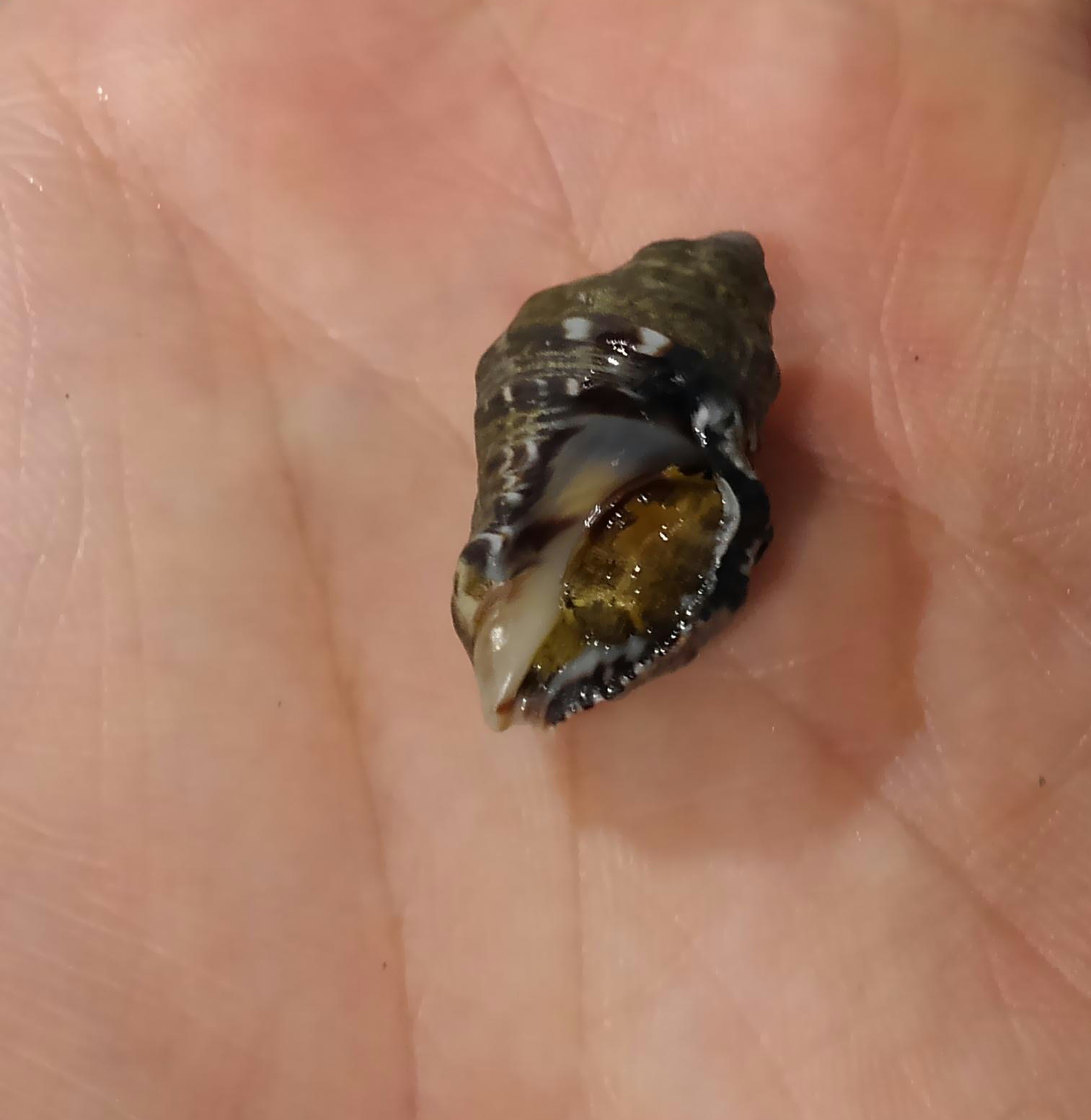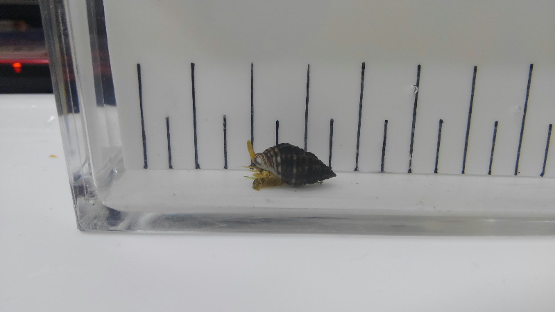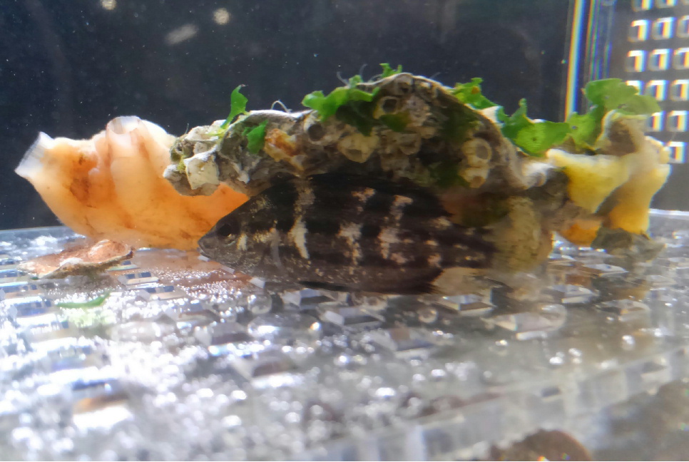 貝殻に潜むイソギンポはもちろん、岩と同化するソイや暗い岩穴の奥に潜むイソガニも次々と発見。 極めつけは、貝殻に藻が生えはっきりいって石ころにしか見えないユビナガホンヤドカリ(大きさ1cm)も流れるように発見。