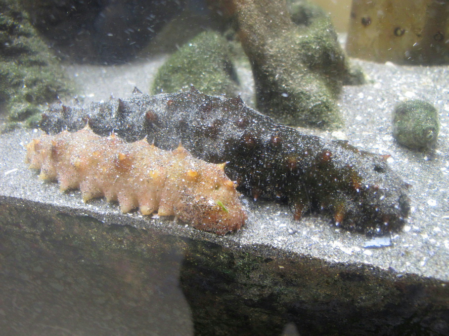 私は飼育作業の際、水槽に子供が来ると、このマナマコやカニ、ヤドカリなどを触らせていました。 マナマコには迷惑だったかもしれませんが、触った子供たち、そしてその親も大喜びで、マーレ水槽最大の功労者だったと思います。