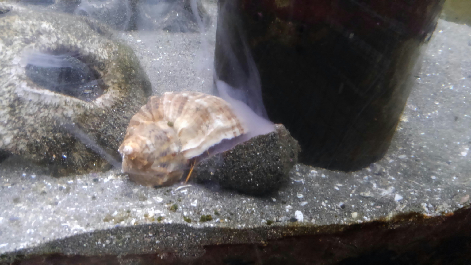 この中でアカニシは3年前入れた1個が白化し、その後行方不明になり、 岩の下でグロッキーかと思われたのが、暮れに好物のアサリを入れたら姿を現した。