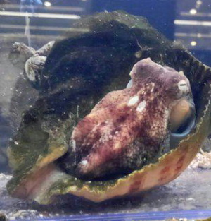 いつもなら他の魚のエサにやると、マダコも「ワタシにもエサをちょうだい!!(メスです)」と言わんばかりに暴れまわるのですが、 その日は植木鉢の中に入り、カキの貝殻で自分の体を隠してピクリとも動かない。