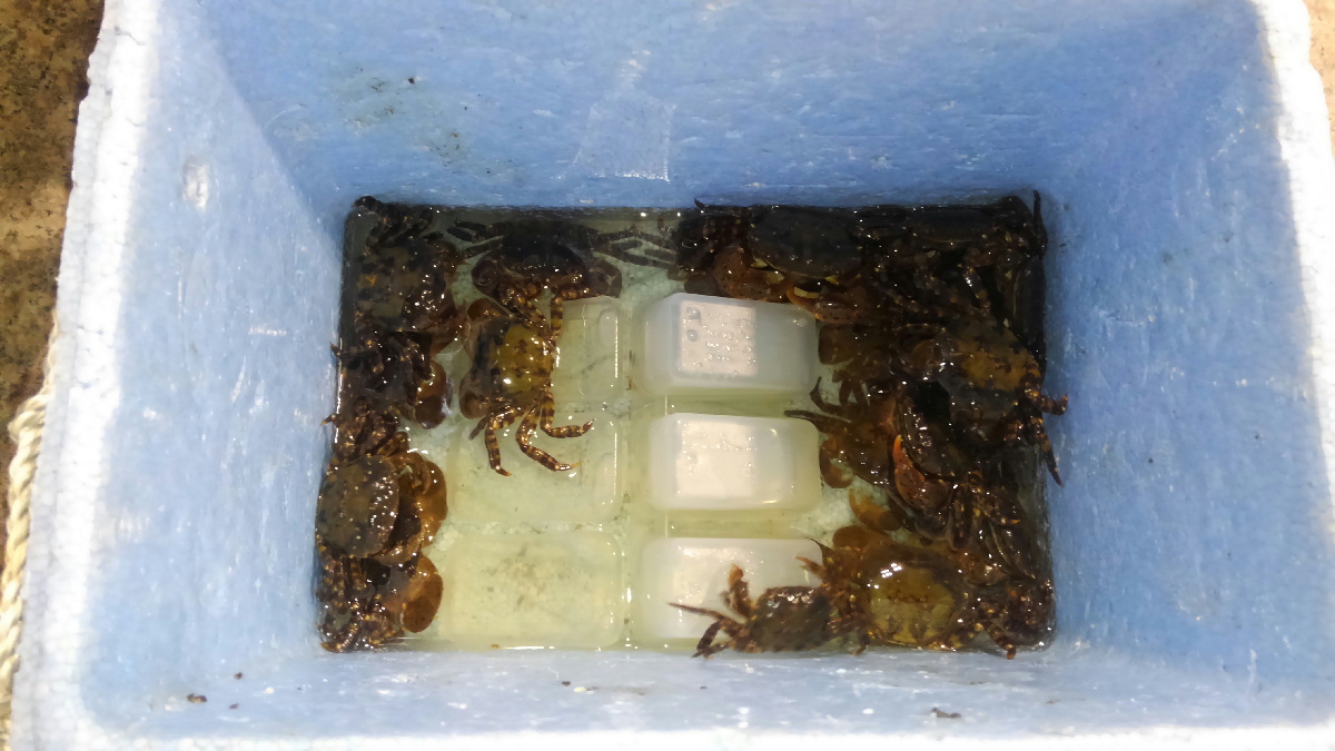 その日は、マダコのエサ用のイソガニを採集し、「先週は違うカニだったから、今日は大好きなイソガニを多めに食わせてやろう♪」と 意気揚々と市役所に向かったのですが、水槽を見るとどうも様子がおかしい。
