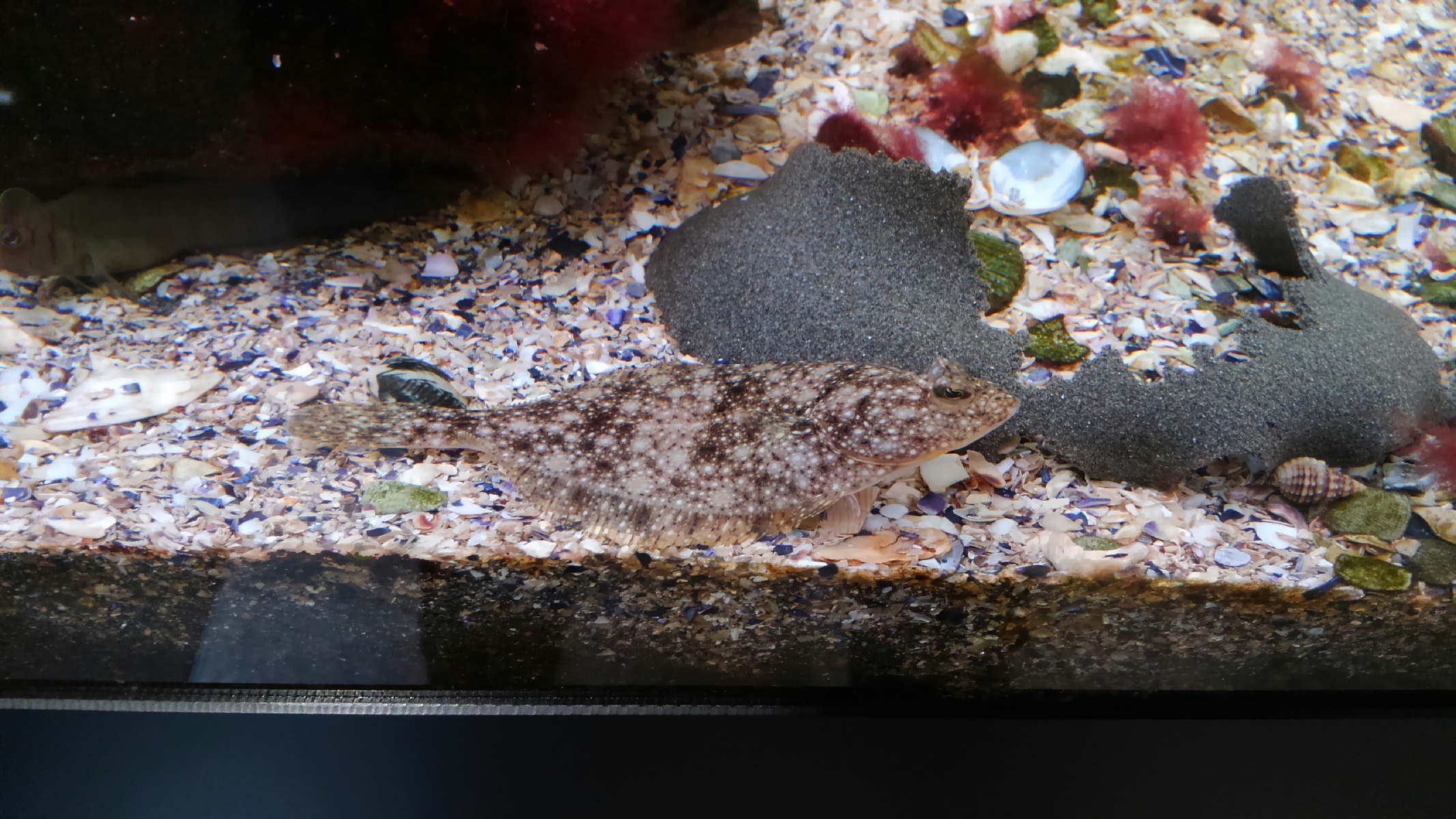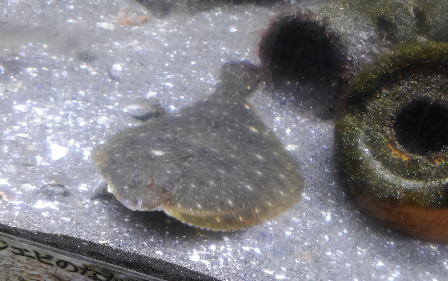 マーレ水槽にいたイシガレイとコショウダイは市役所水槽に移しました。このイシガレイ、かなりの人気だったようで、色々な世代の方から「カレイいなくなっちゃったの?」と切なそうに聞かれます。市役所水槽で元気にやっていますので、ご安心ください。そして、新入りのマコガレイを可愛がってやってください。しかし砂に隠れるのが上手くて、イシガレイほど激しく動かないマコガレイに反応はイマイチのようです。