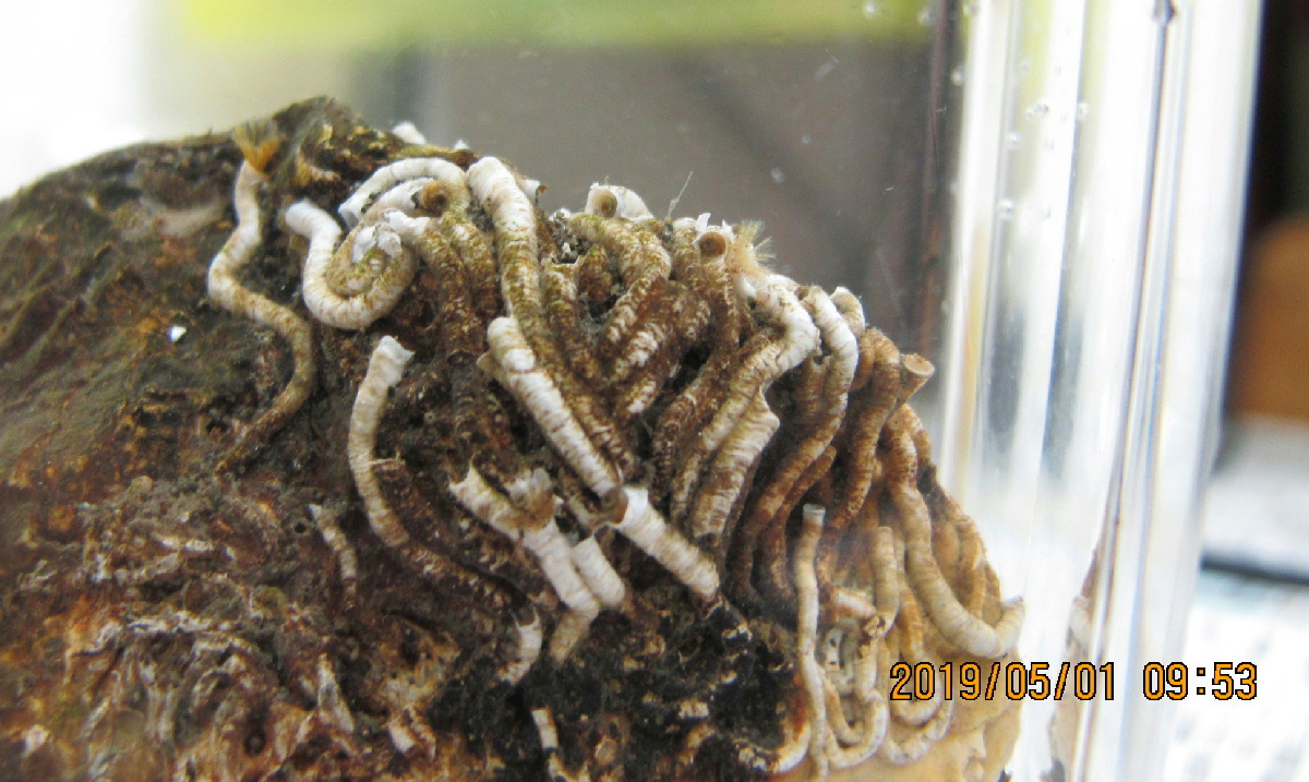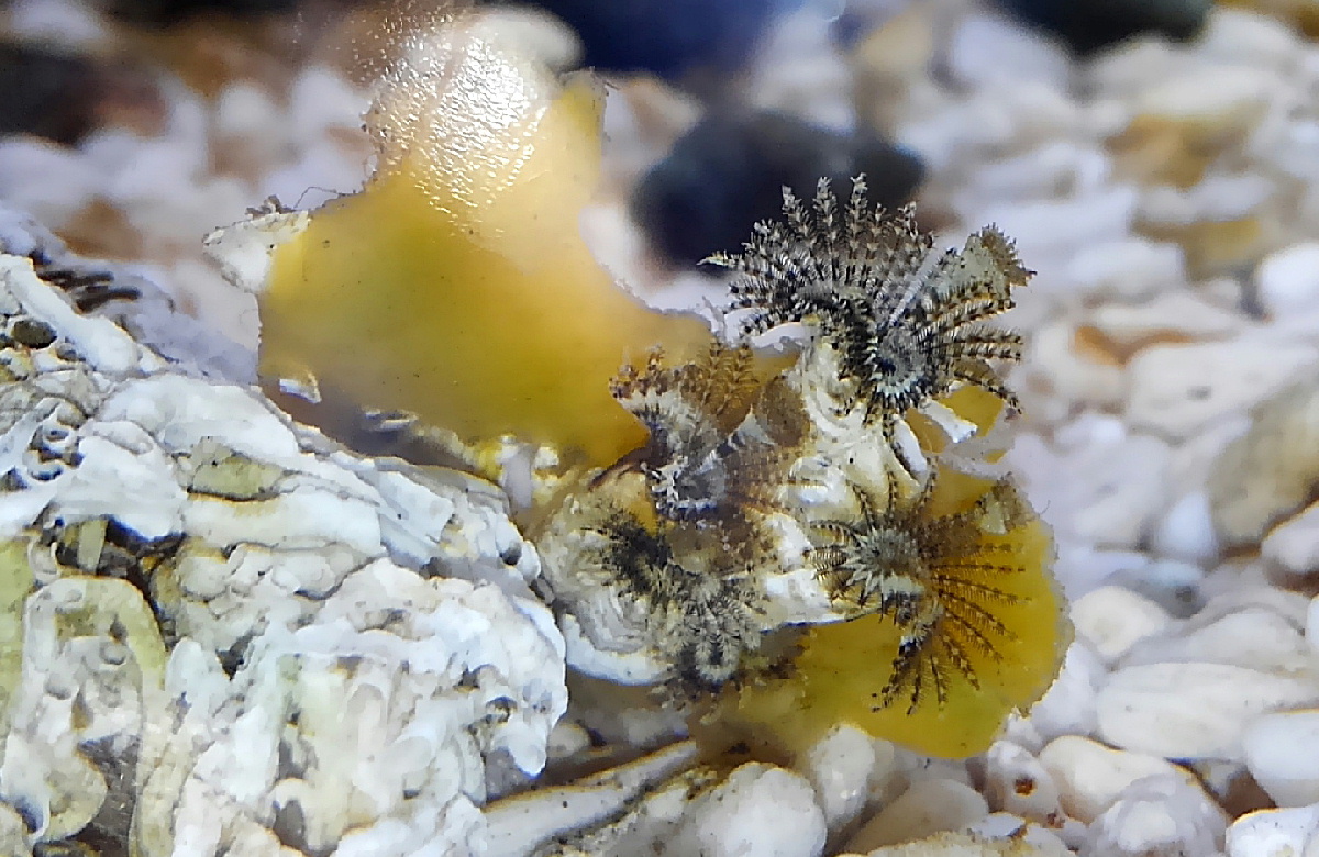 浦安で見られるカンザシゴカイ類の鰓(鰓冠)はオレンジ色だったり、青と緑が混ざったような色だったり、 白と褐色のマシマだったりとバリエーション豊かでどれも美しいです。