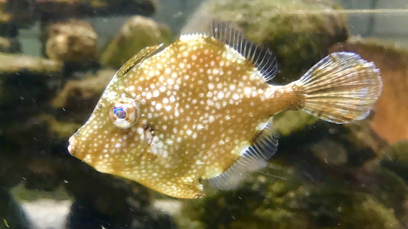 マーレ水槽で2年半共に過ごしたアミメハギの死。コイツははエサを食べるのがあまり上手でなく、他の魚にエサを奪われてしまうのでピンセットやスポイトを使ってエサを与えていました。