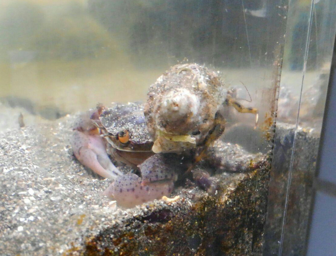 餌を与えるといつもイソガニ達がケンカをしながら出てくるのですが、今日は古参の大きな一匹のみ…。岩陰を探すと無残にもバラバラにされた新入り達の姿が・・・(泣)仁義なき戦いがあったようです。カニの入れすぎには要注意ですね。